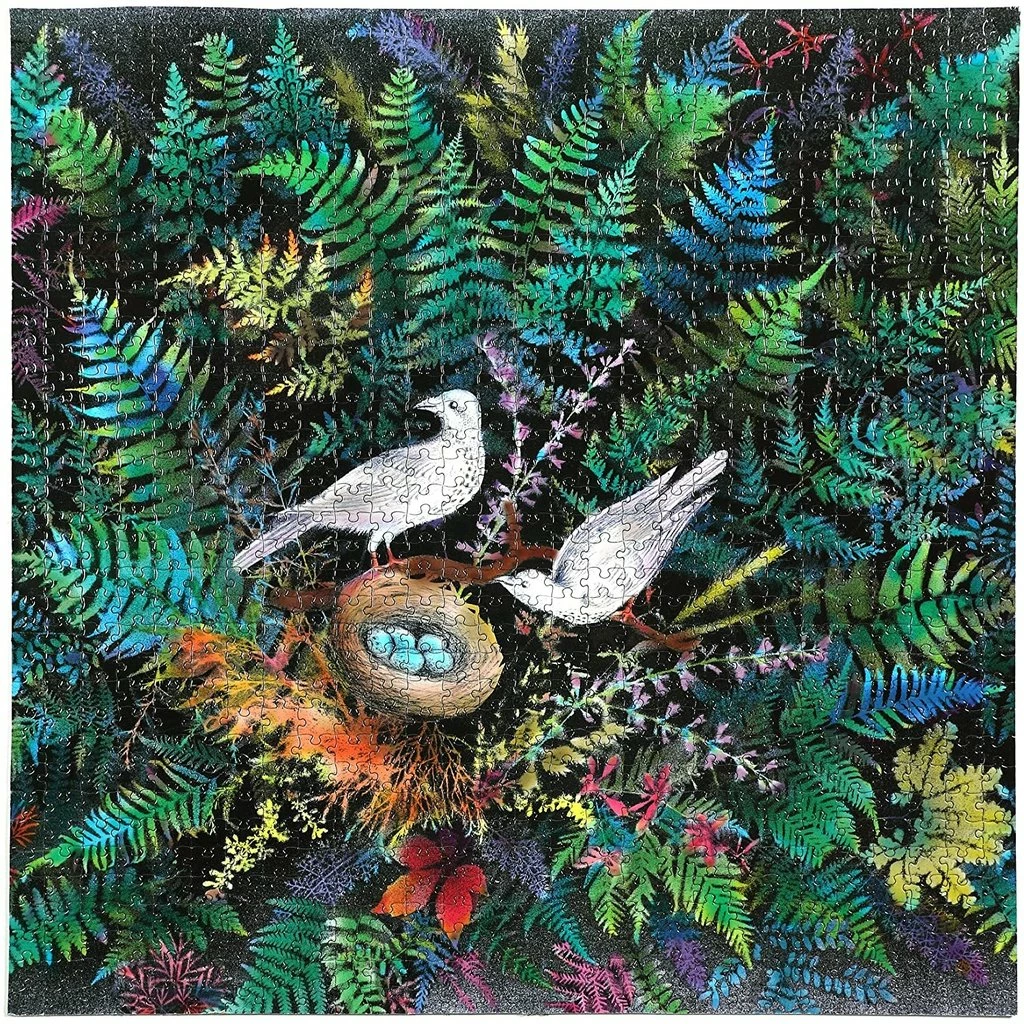 Puzzle your way through eeBooโs Piece and Love Birds in Fern 1000 piece square puzzle, inspired by a vintage drawing. This beautiful fern garden featuring a family of birds will transport any family of puzzlers into focused calm. Our 1,000 piece square jigsaw puzzles are thoughtfully commissioned and beautifully designed to offer a screen-free, relaxing way to practice contemplative mindfulness or share a gentle cooperative activity with friends and family.