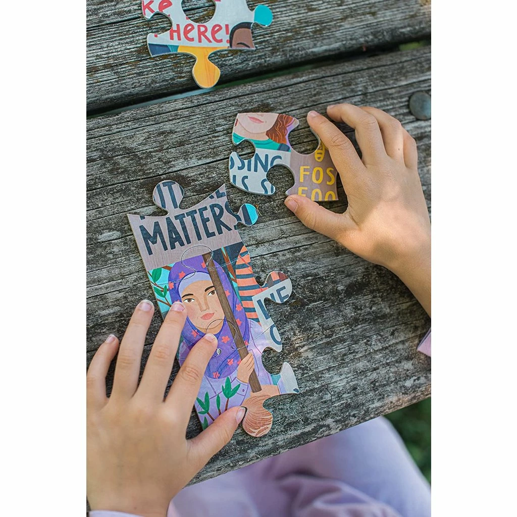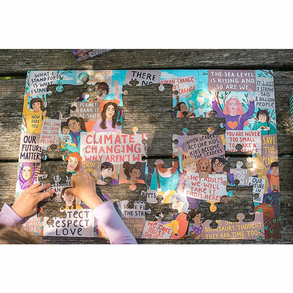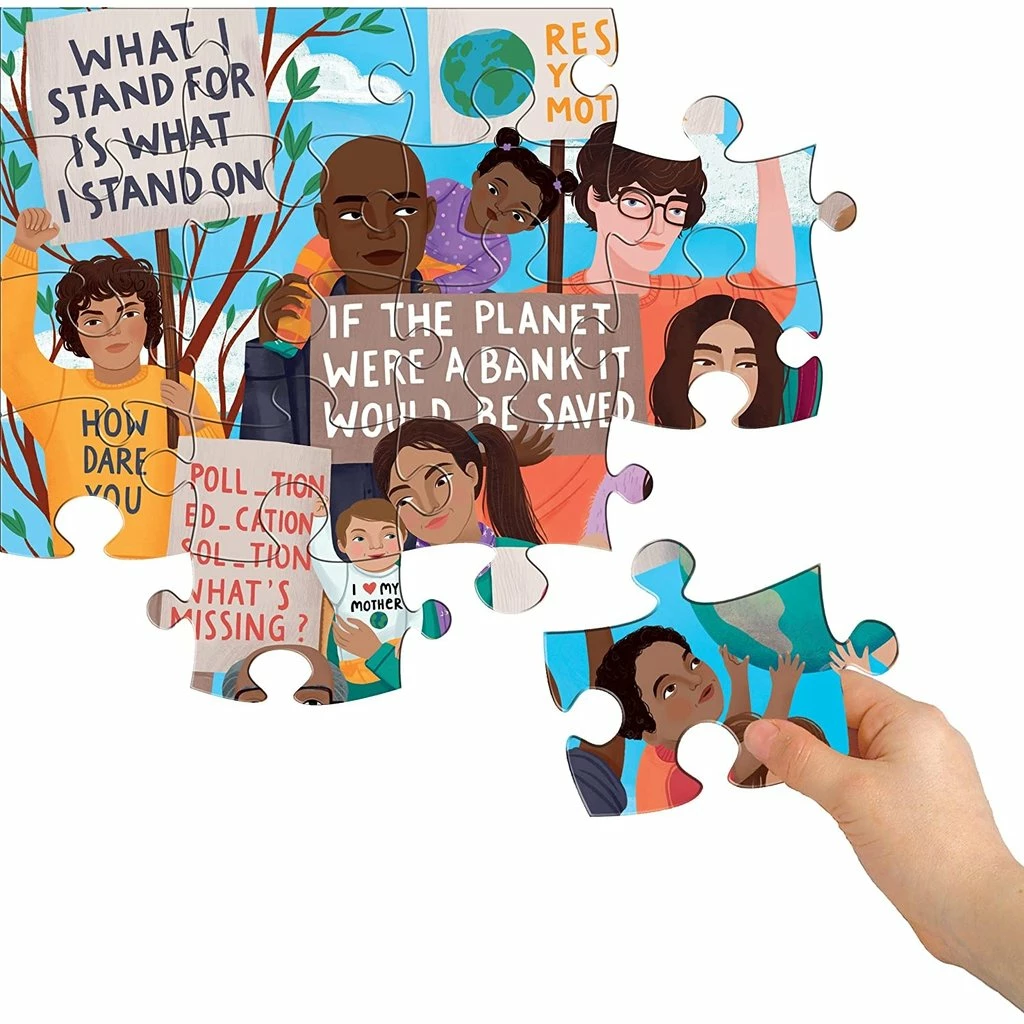 Our planet needs us. We’re its voice. Demand we make the proper choice! An homage to the Climate marches that have erupted around the world as a new generation of global citizens find its voice. Our 100 piece jigsaw puzzles are thoughtfully commissioned and beautifully designed, an ideal transitional format between simple children’s puzzles and more challenging adult jigsaw puzzles. They offer a screen free, relaxing way to practice patience and concentration while sharing a gentle cooperative activity with friends and family.