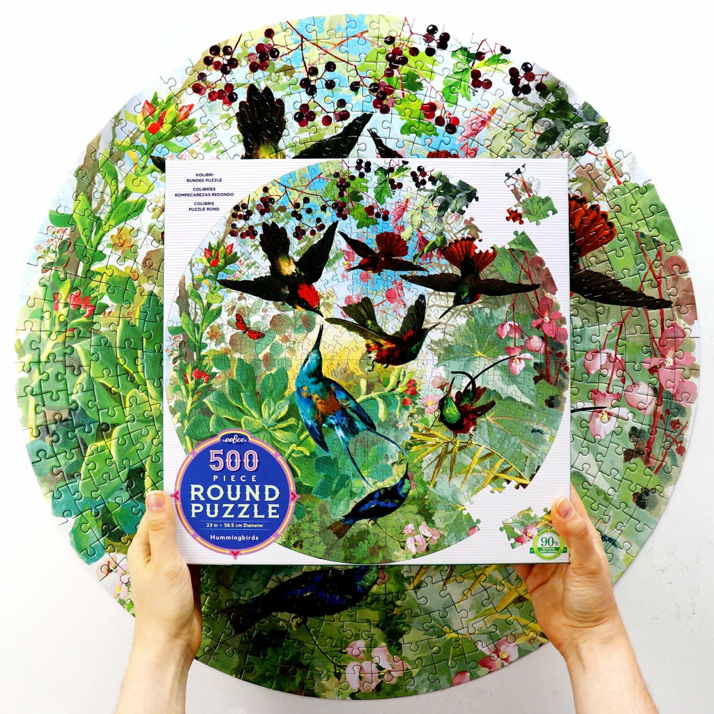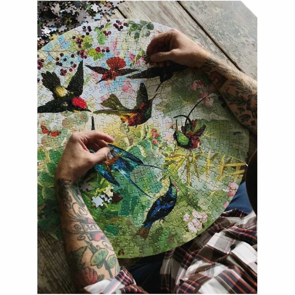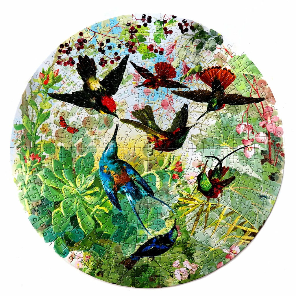 Take on the extra challenge of a round jigsaw puzzle inspired by vintage ornithological illustrations. This beautiful garden full of Hummingbirds in flight will transport any family of puzzlers into focused calm.