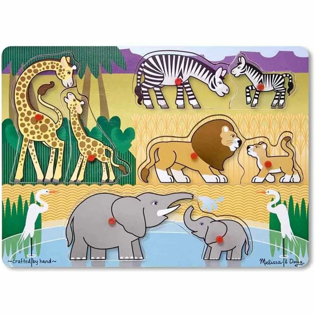 Your child will “go wild” matching the baby animals to their parents in this sturdy wooden Peg Puzzle โ Safari from Melissa & Dougยฎ. Easy-grasp pegs and pictures under the pieces will help your child solve this simple 8-piece puzzle.