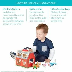 Fit the 10 wooden play pieces into shaped holes in the sturdy wooden barn, or stand the pieces up for pretend play. Flip up the barn roof for quick and easy access, and use the handle to take playtime anywhere. A perfect gift for toddlers and preschoolers two and older, the chunky pieces (ducks, horse, pig, goat, sheep, chicken, dog, cow, tractor, and farmer) are easy for little hands to grasp and maneuver, and help promote fine motor skills, matching and sorting, and creative play. Take Along Sorting Barn is designed by toy makers Melissa & Doug!