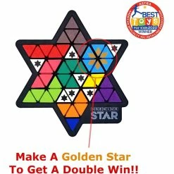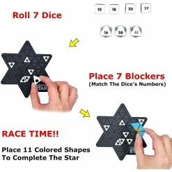 Boost your IQ with this challenging puzzle from MUKIKIM. The Genius Star™ game includes one set of 7 dice, plus two of each: star-shaped grid, 7 round blockers, and 11 colored shapes. Roll the dice, which direct where the blockers are placed on the star. Then, try to fill in the rest of the star’s spaces with the colored shapes. All of the arrangements have at least ONE possible solution, guaranteed! Play solo or race a worthy opponent to solve one of the 165,888 – and no, that’s not a typo! – unique puzzles!