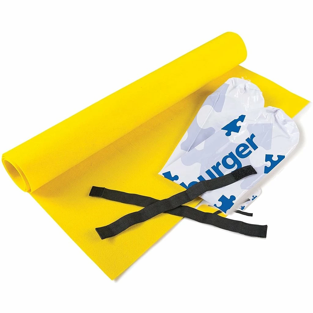 - Puzzle Stow & Go!™ kit includes inflatable tube, felt mat and 2 elastic bands.