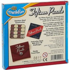 Fifteen Puzzles are one of the world’s most recognized and popular puzzles. Players scramble the numbers and then put them back in numerical order. This puzzle from ThinkFun is constructed of smooth, polished stainless steel and decorative enamel. It has thirty-one challenges, instruction booklet with solutions and leatherette travel case.